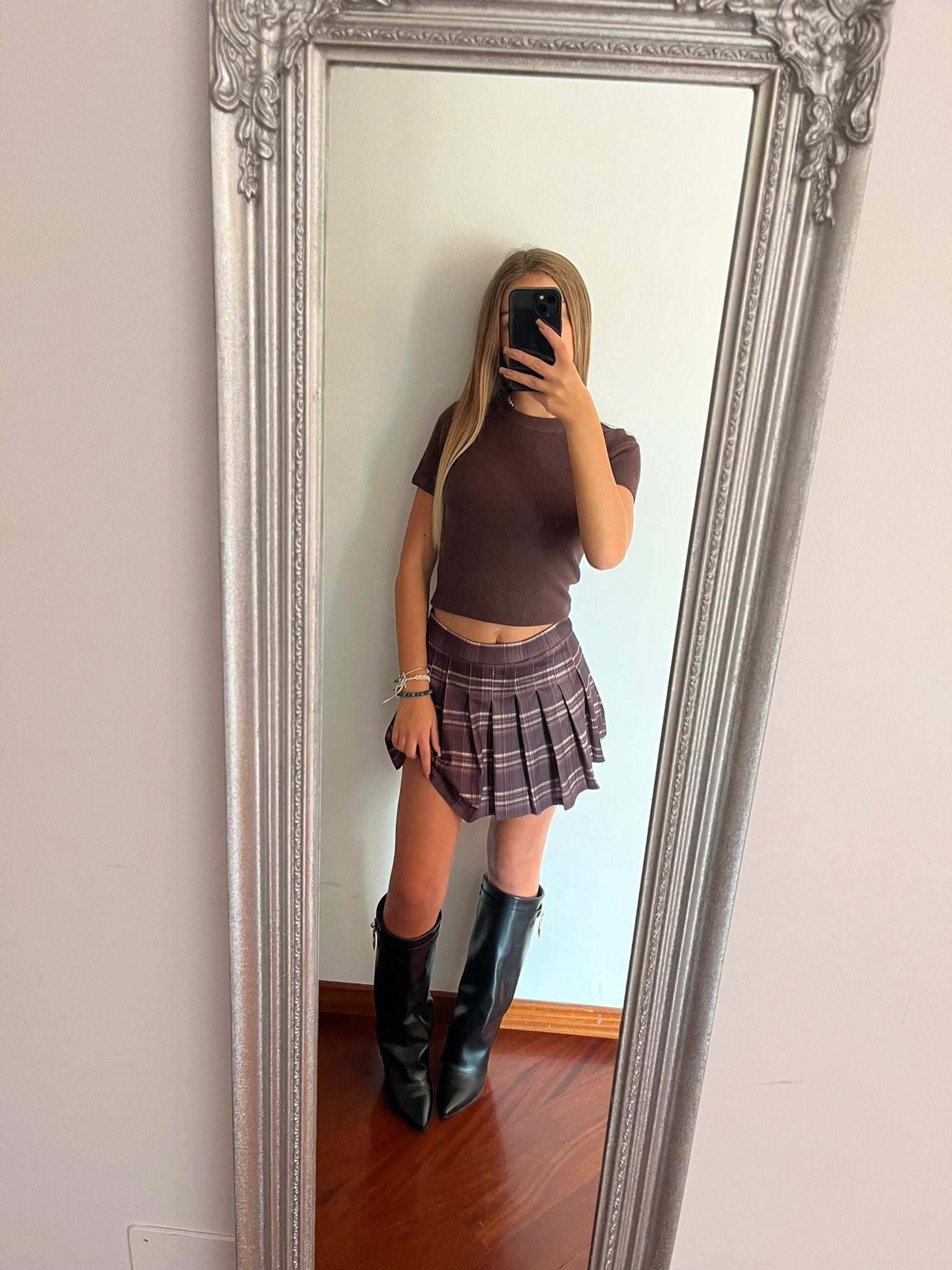 Maglioncino semi crop in lanetta rasata mezza manica. Taglia unica veste XS/S/M. Nella stessa foto minigonna a quadri con pantaloncino interno in microfibra.