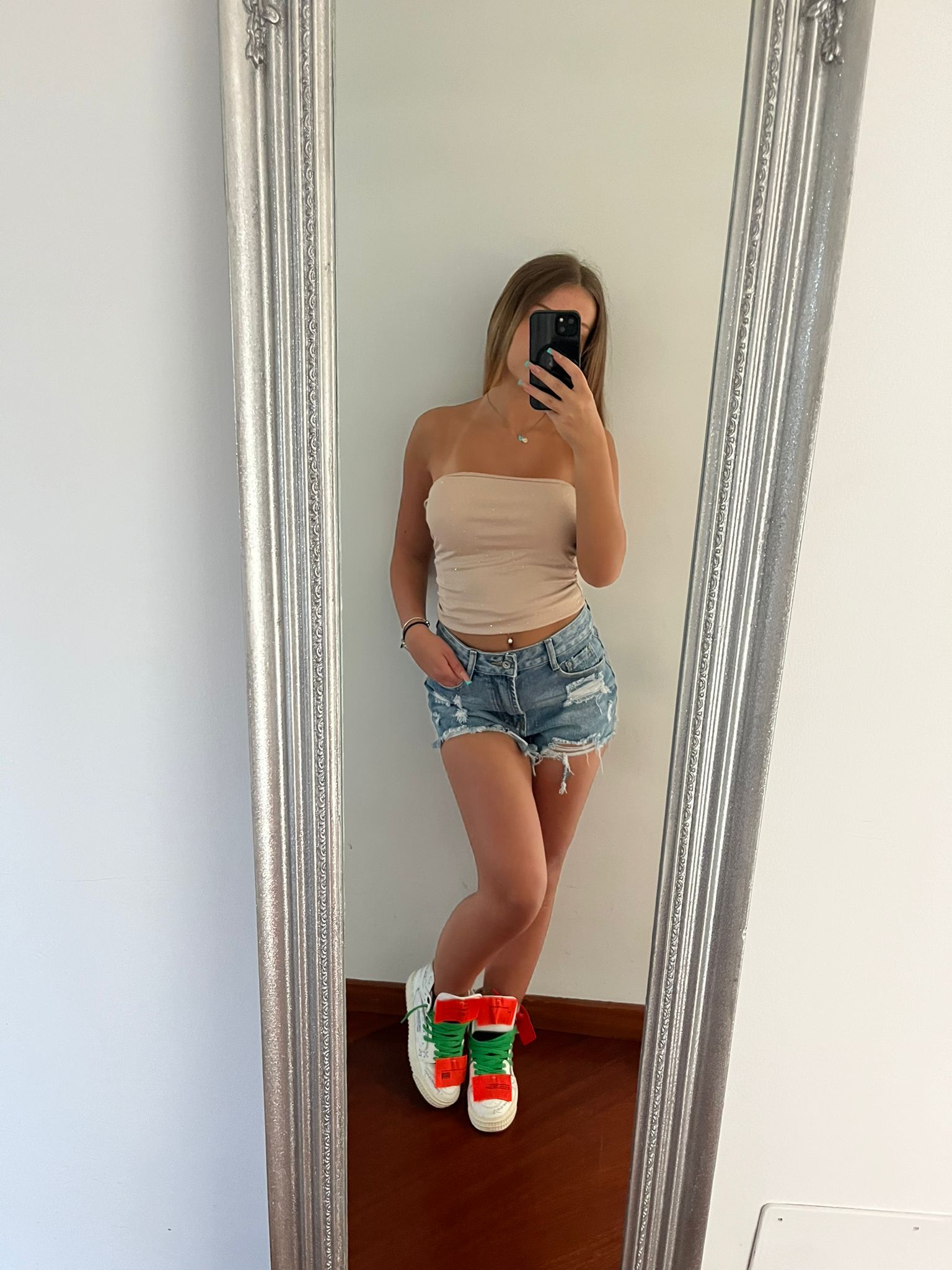 Top beige brillantinato con coppe facile da abbinare giorno e sera. Taglia unica Vestibilità XS/S/M