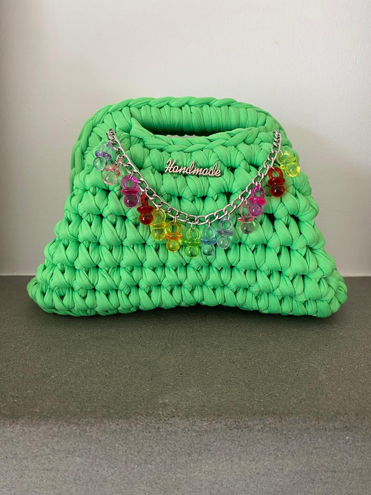 Borsetta fatta a mano verde acido con ciondoli 25x16x13cm
