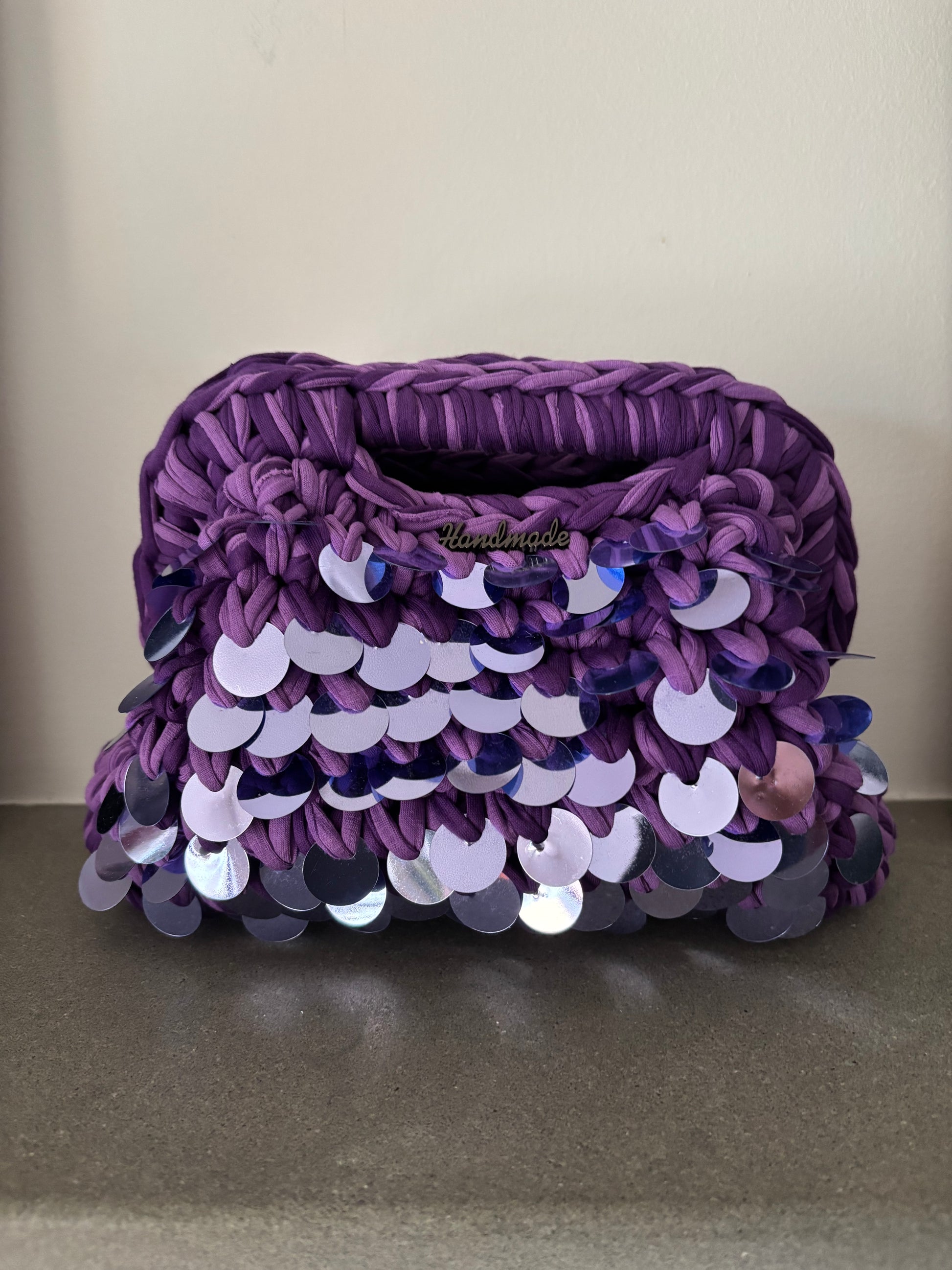 Borsetta fatta a mano bicolore viola (chiaro e scuro) con paillettes 29x20x19cm
