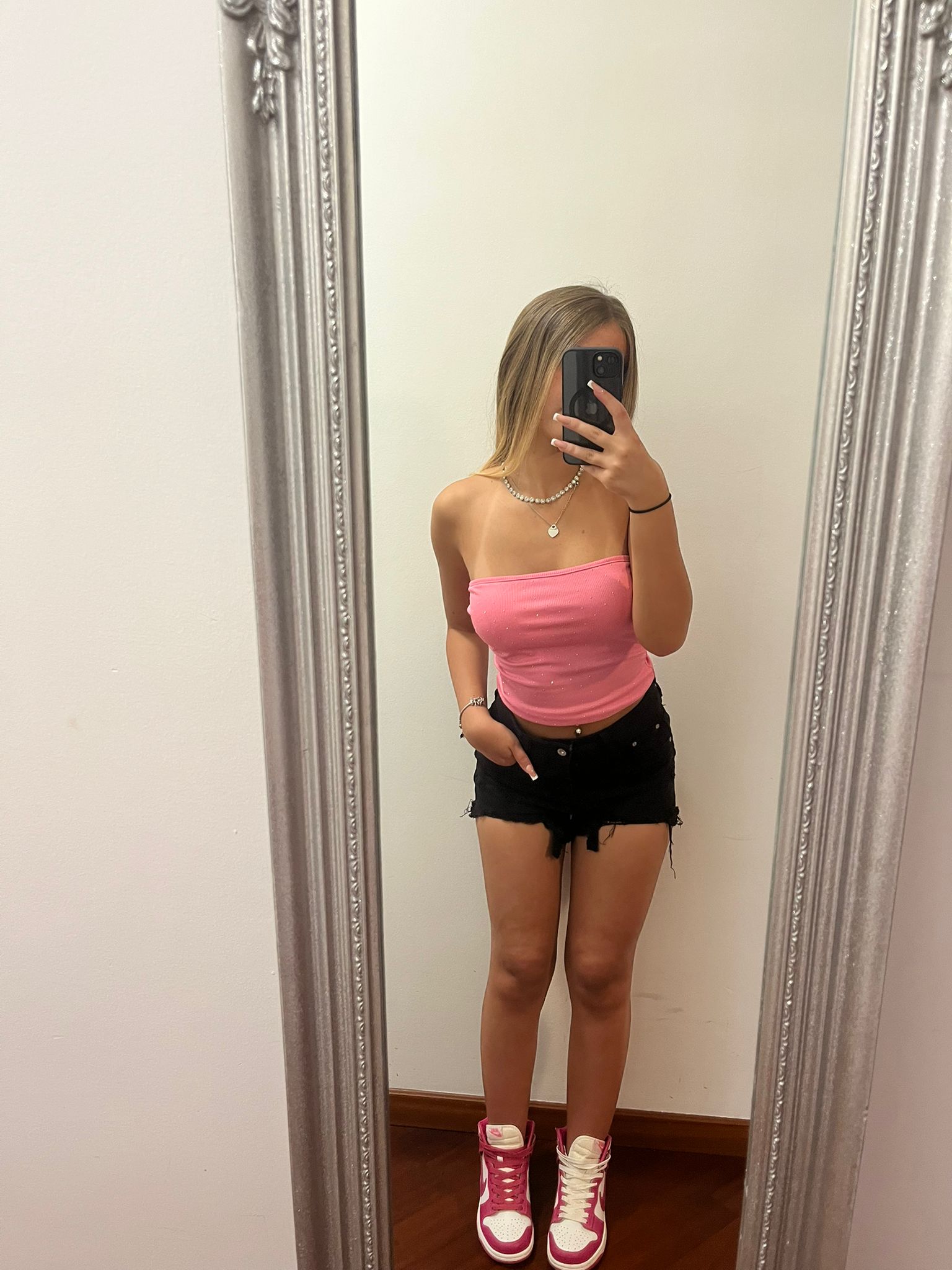 Top rosa brillantinato con coppe facile da abbinare giorno e sera. Taglia unica vestibilità XS/S/M