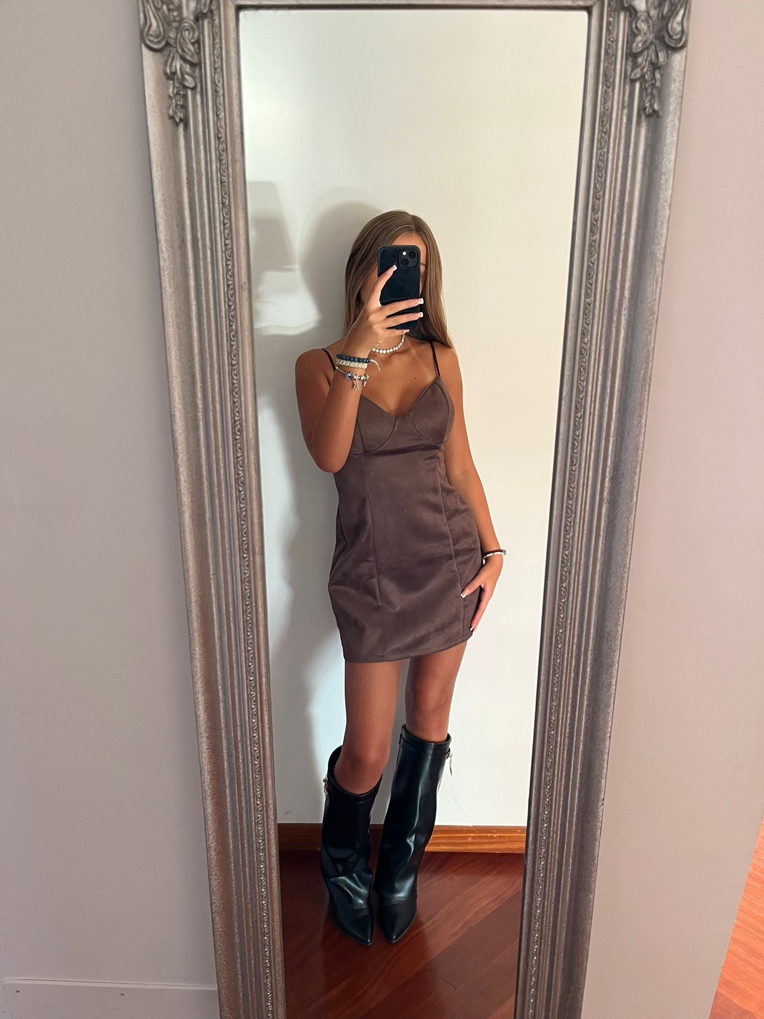 Tubino alcantara brown. Modella 165 52kg. Vestibilità morbida veste XS/S