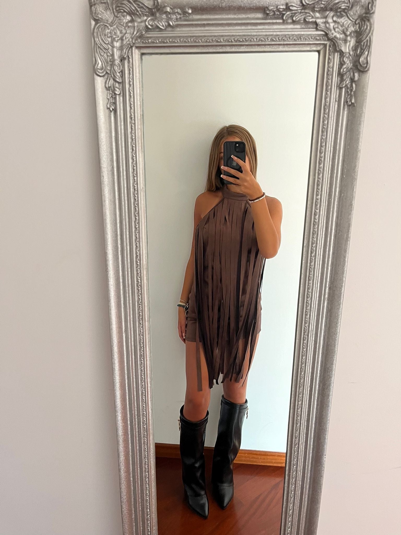 Tubino alcantara con frange brown taglia unica.