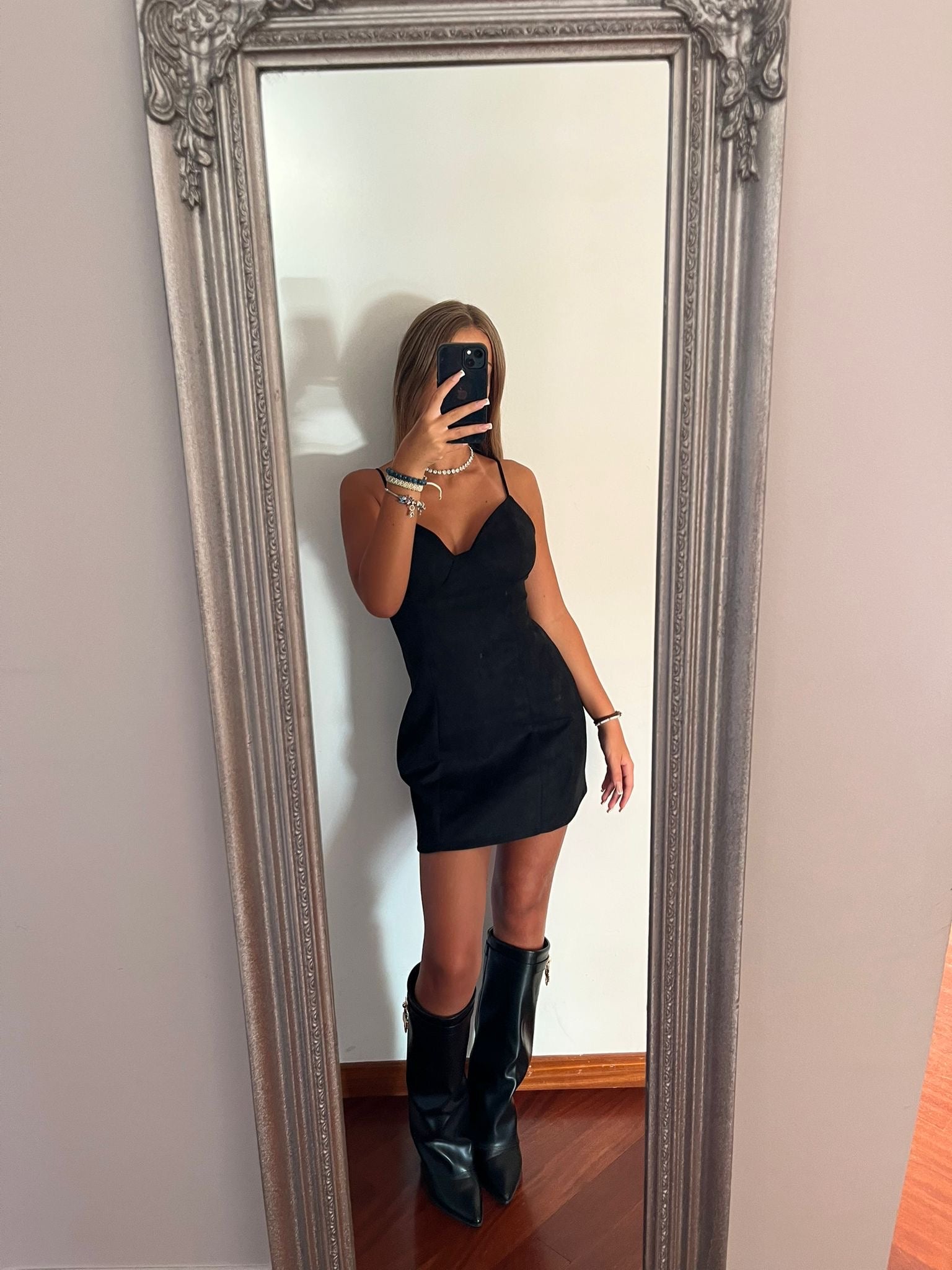 Tubino alcantara nero. Modella 165 52kg. Vestibilità morbida veste XS/S
