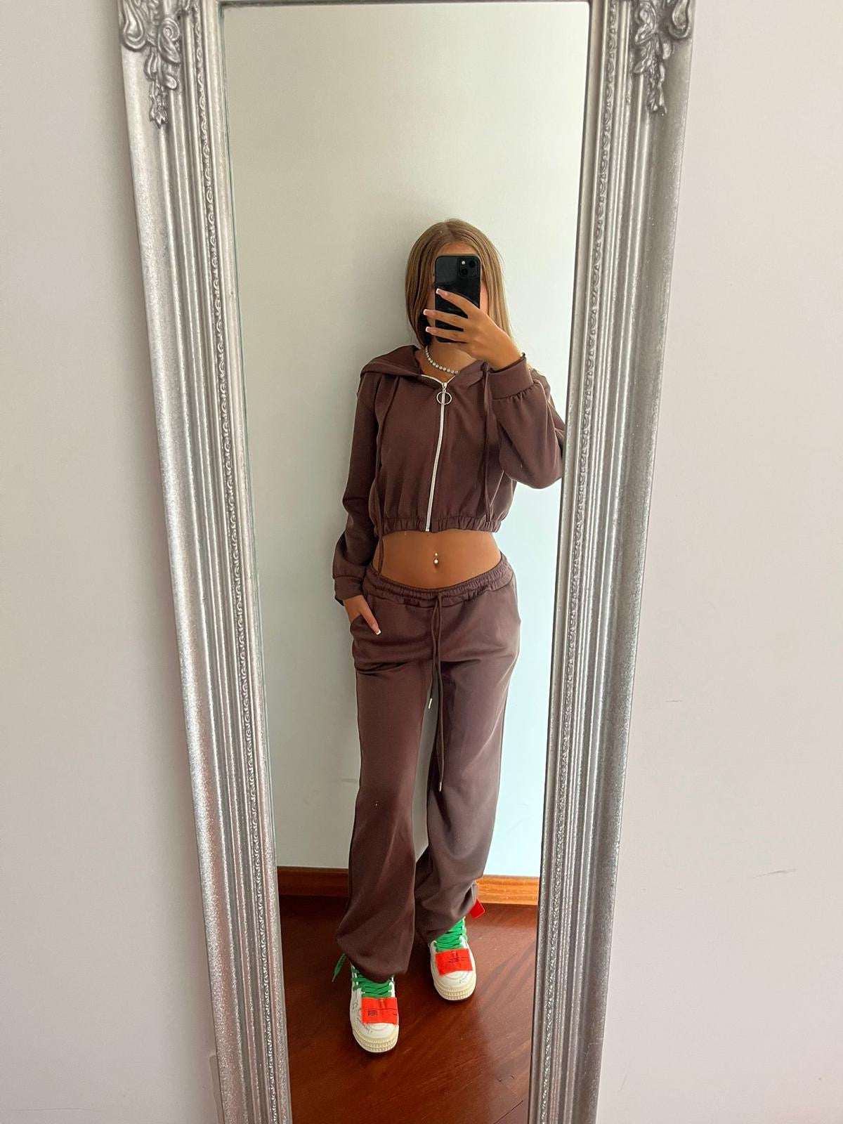 Tuta marrone crop. Taglia unica articoli acquistabili separatamente. Felpa crop con cappuccio. Vestibilità dalla 40 alla 44